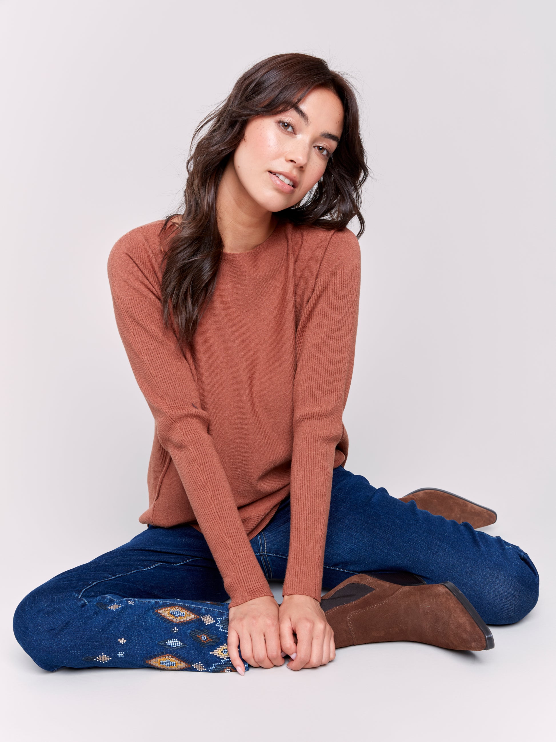• Plushy Knit Crew Neck Sweater With Long Rib Sleeves and Back Lace Up Eyelet Detail