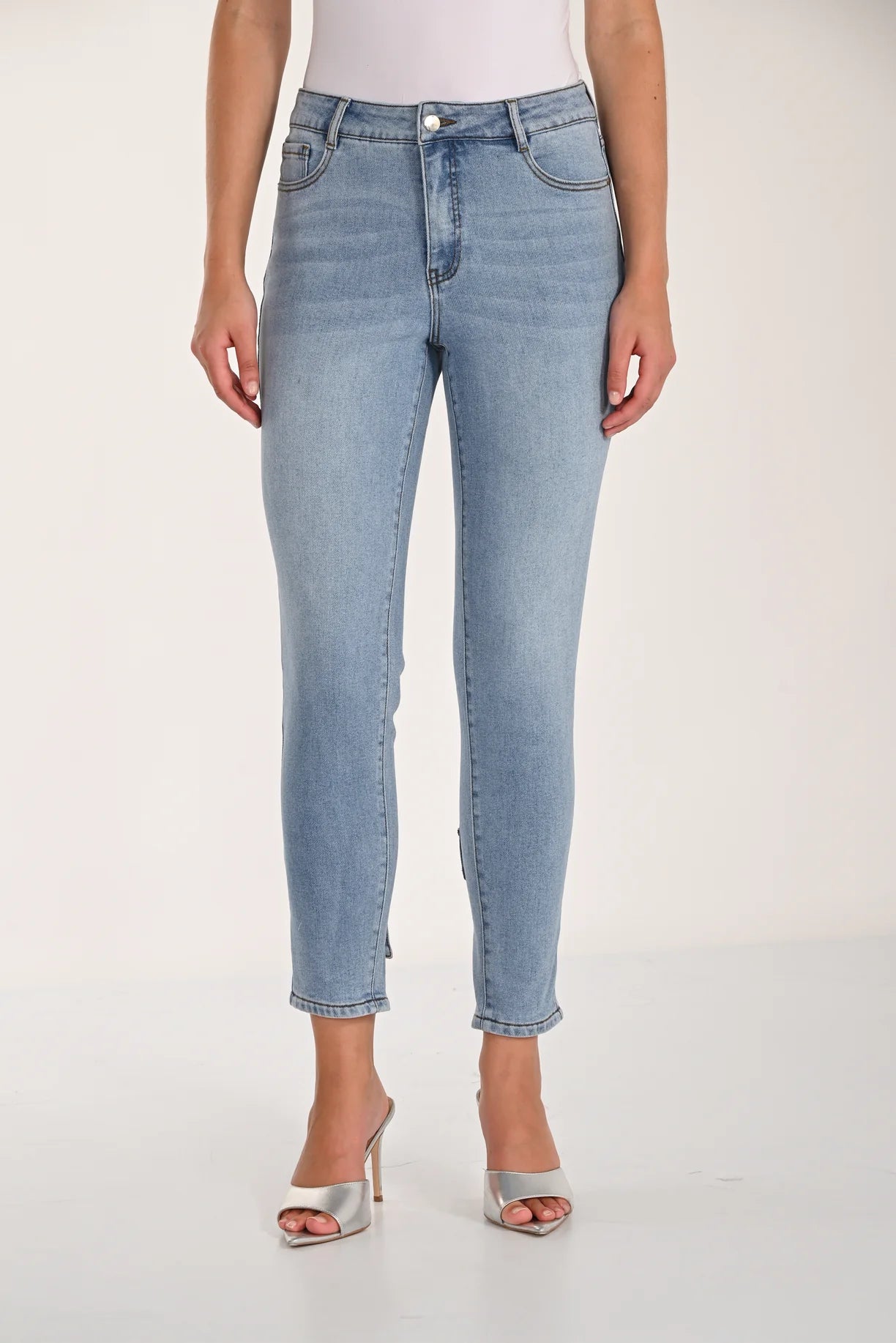Light wash denim cropped pant with a super cute blingy bow at the back of the ankle