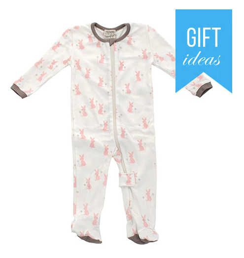 Organic cotton footed sleeper with easy dressing zipper is baby basics. We keep stock all year around. When the baby's diaper gets changed, their body is still covered without completely opening the zipper.